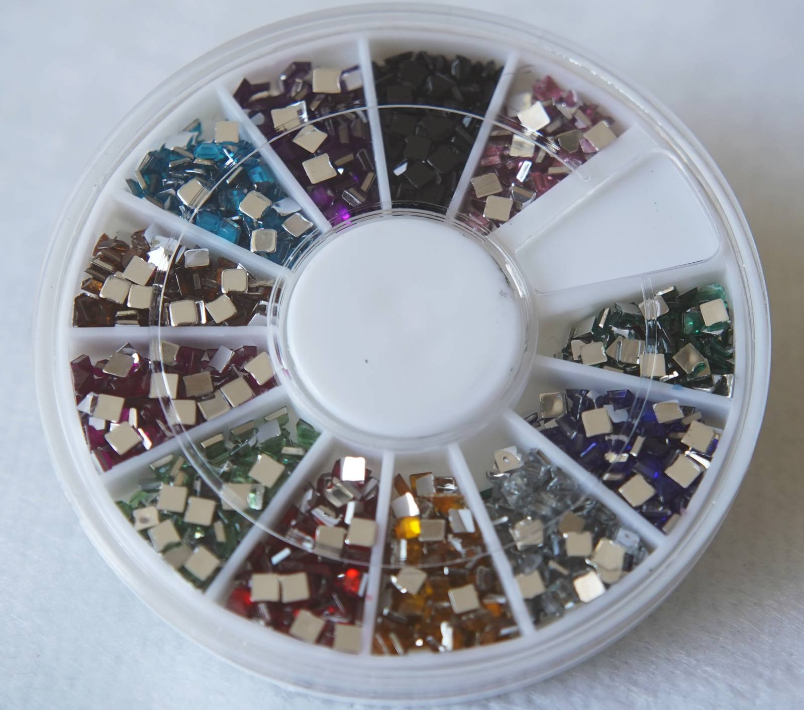 Kolesca so zelo polna - vsebujejo kar 500 kos različnih kvadratastih kamenčkov za okraševanje nohtov.