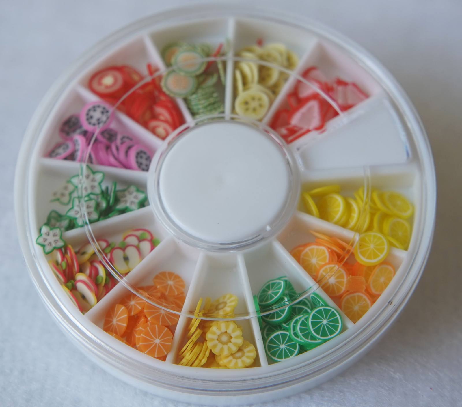 Kolesca so zelo polna - vsebujejo različno sadje iz fimo mase za okraševanje nohtov.