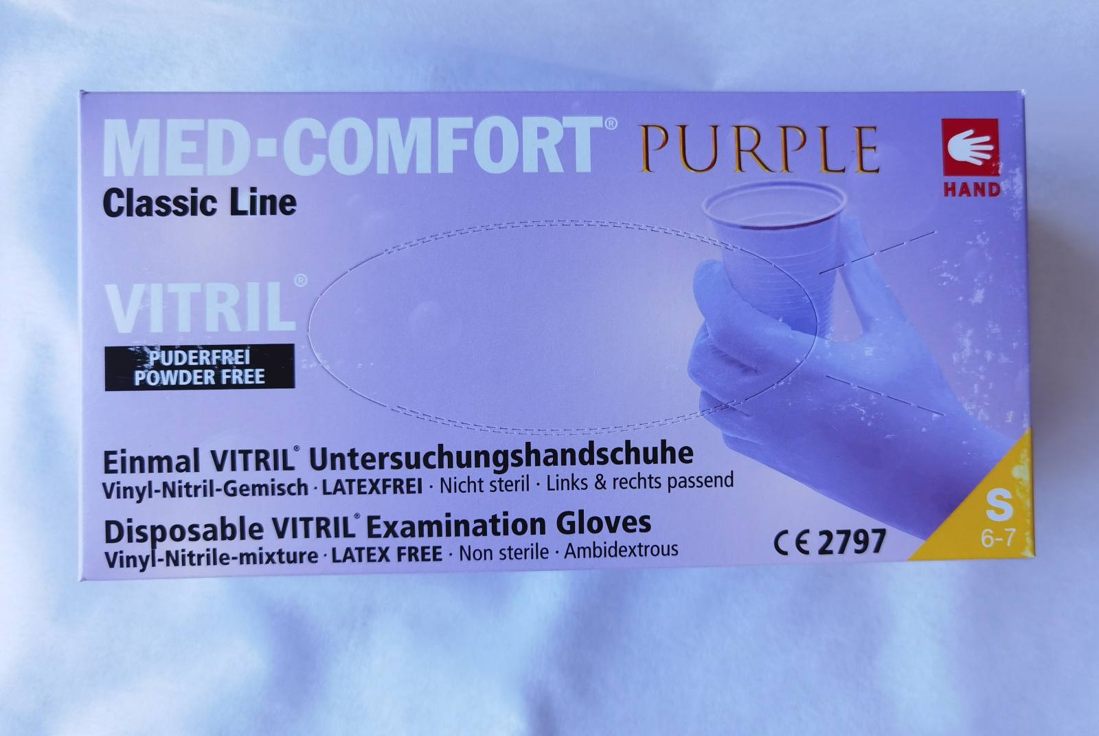 100 kosov vitrilnih rokavic vijolične barve. Prednosti vitrilnih rokavic so:- udobje pri nošenju- vrhunska zaščita - odpornost na mehanske poškodbe- odlična alternativa lateks zaščitnim rokavicam, posebej glede varnosti in zaščite